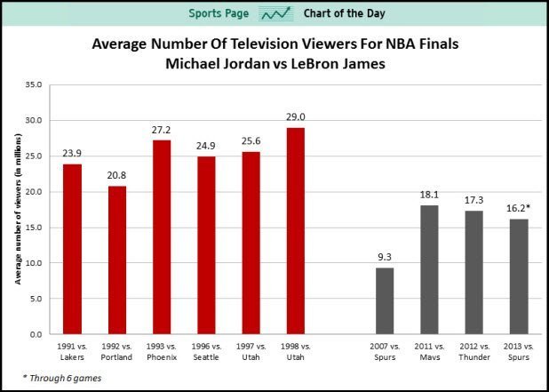 如果觀眾不喜歡職業(yè)棒球賽,也許他們喜歡看NBA籃球賽呢!可惜,現(xiàn)如今的籃球巨星們已無法像以前一樣抓住電視觀眾的眼球了。
