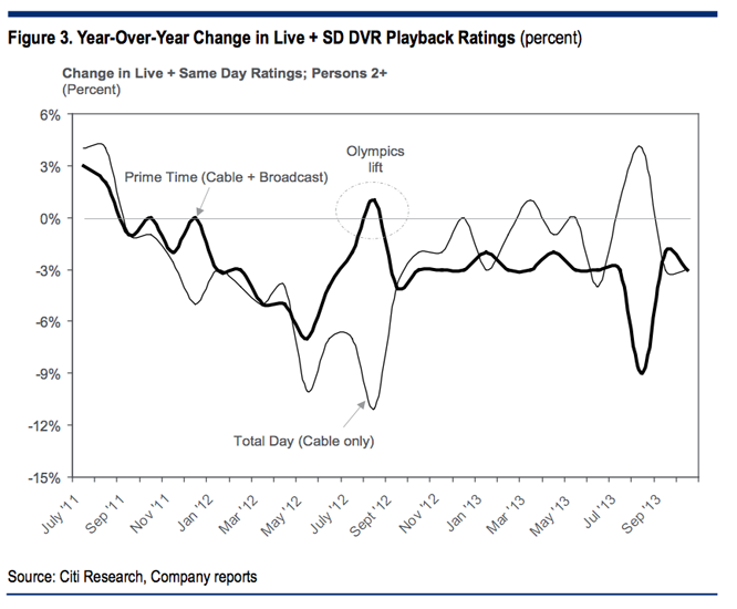 Research)稱,從2011年9月以來,廣播電視和有線電視的收視率,一直呈現(xiàn)出負(fù)增長,僅在奧運會期間有所緩解。