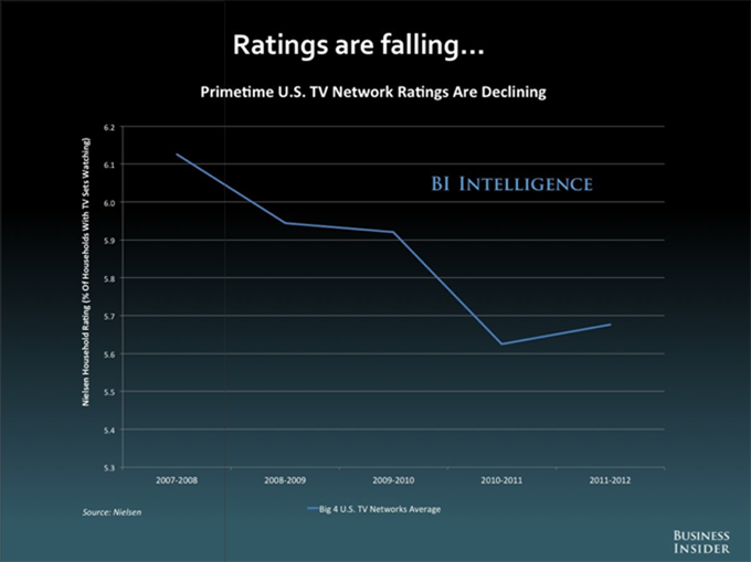 這是一個宏觀的問題:收視率正在全盤下跌。這種情況已持續(xù)了好幾年。廣播電視的收視率下跌并不怎么令人驚訝。多年來,主流廣播電視網(wǎng)一直面臨著來自有線電視頻道以及AMC和HBO等優(yōu)質(zhì)電視節(jié)目供應(yīng)商的激烈競爭。
