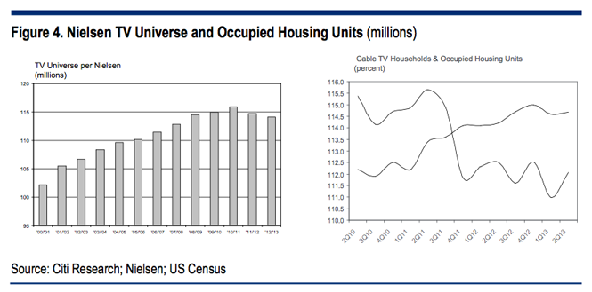 這些來自花旗研究機構(gòu)的圖表顯示,全球觀看電視的人數(shù)正在減少。值得指出的是,美國的家庭數(shù)量仍在增加,但是訂閱有線電視的家庭數(shù)量卻在減少。
