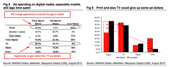 麥格理投資銀行(Macquarie Capital)的研究表明,消費者長時間呆的地方與廣告商投錢的地方嚴(yán)重錯位。現(xiàn)在,人們花費在數(shù)字媒體上的時間多于電視;而廣告商投放在電視上的廣告費用卻要高于數(shù)字媒體。麥格理投資銀行稱,從長遠(yuǎn)來說,這種錯誤最終會得到糾正,廣告費用會逐步轉(zhuǎn)移到數(shù)字媒體上。
