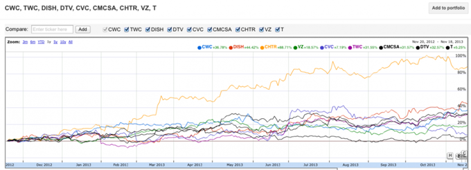 下圖顯示的是多只有線電視股票去年的表現(xiàn)。說實話,還真不錯!
