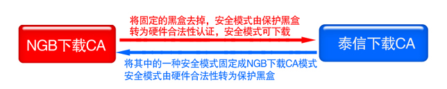 目前,泰信下載CA的接口規范已經符合NGB下載CA,如果總局動員各種資源,強力推動符合NGB下載CA規范的芯片產業成熟,屆時,泰信下載CA將不作任何改動就可以完全滿足NGB下載CA的規范要求,這相當于將泰信下載CA的一種安全模式固定為符合NGB的黑盒安全模式。NGB下載CA和泰信下載CA之間的關系如下: