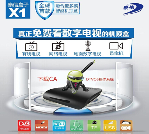 泰信盒子X1是國內(nèi)首款多模智能機頂盒,集有線電視、網(wǎng)絡電視、免費地面數(shù)字電視三合一,還可一鍵錄制電視節(jié)目。此款盒子是市面上唯一一款基于安卓系統(tǒng)的地面數(shù)字電視盒,看數(shù)字電視永久免費!是一款適合家庭娛樂的功能最強大最人性化的智能高清機頂盒。