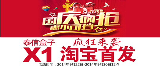 淘寶促銷篇:泰信盒子X1于9月20日在淘寶官方店全球震撼首發(fā)。此次國慶前夕,繼續(xù)加大促銷力度,在優(yōu)惠直降300元的基礎(chǔ)上還送AV線套裝。詳情:http://shop112060586.taobao.com/