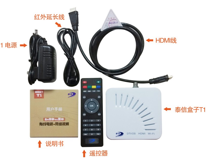 配件方面,包括泰信盒子T1,DC適配器,紅外擴(kuò)展線,遙控器以及一條1米長的HDMI高清線。別的不說,光這條HDMI高清線怎么也得30塊,可見泰信電子做得是相當(dāng)厚道。