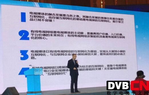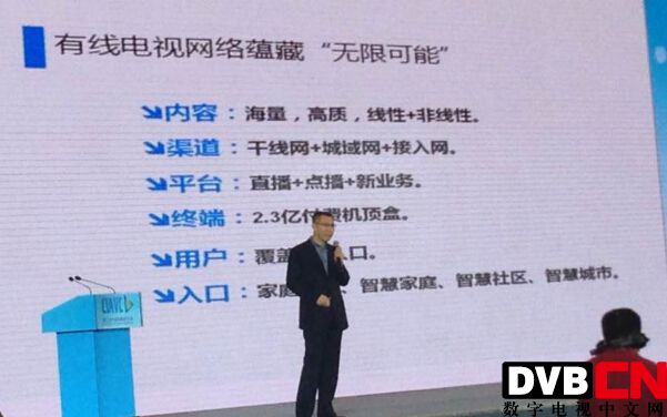 12月16日,中國廣播電視網絡有限公司總經理梁曉濤在第二屆中國網絡視聽大會上從“電視屏互聯網化是電視媒體融合發展的根基、有線電視網絡是電視屏互聯網化的核心、有線電視網絡互聯網戶的目標與路徑、廣電國網公司融合發展戰略”四個方面作了演講。