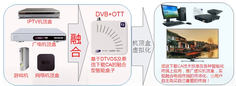 泰信基于下載CA延伸出DTVOS直播電視操作系統(tǒng)和虛擬機(jī)頂盒軟件及融合機(jī)頂盒硬件產(chǎn)品。其中,融合型智能機(jī)頂盒——泰信盒子,融合有線電視和網(wǎng)絡(luò)電視,實(shí)現(xiàn)全國(guó)跨區(qū)域市場(chǎng)化銷(xiāo)售,受到廣大用戶(hù)的廣泛歡迎。全國(guó)80%以上地區(qū)的老百姓終于有了自主選擇有線電視機(jī)頂盒的權(quán)利!解決了百姓看電視的煩心事兒。