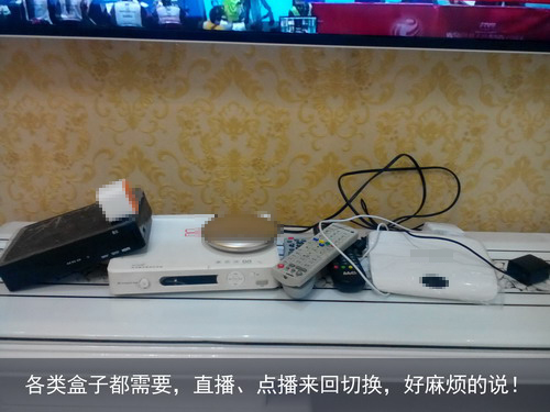 我是一位數碼愛好者,也是電視迷,平時就喜歡看各電視臺熱門娛樂節目,而老公喜歡看籃球和足球等體育賽事,可是他總是沒有時間看電視直播,很遺憾,于是我每次都只能用DV給他錄下來。家里一直用著廣電機頂盒看直播,同時還買了幾臺網絡盒子一起來把玩,就是看不同電視節目時,需要不斷更換盒子,太麻煩。