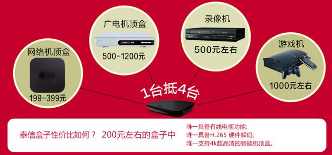 既能收看廣播電視又能收看網絡電視的融合型機頂盒將是2015年機頂盒發展的必然趨勢。支持4k超高清的泰信盒子新品T6已在泰信官方商城、天貓、京東等平臺上線銷售。