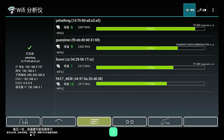 WIFI分析儀測試結果。其中yehaifeng信號距離T6S直線距離大約5米,間隔一堵吃重墻。
