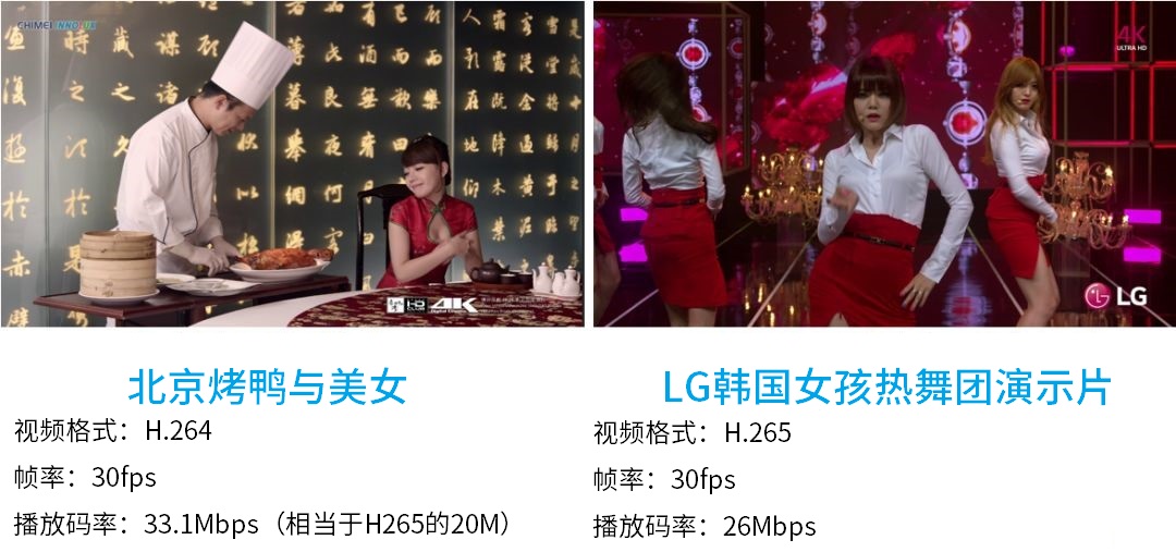 這是我們在電視賣場經常看到的兩個4K超高清演示片及參數。這樣的碼流速度即使你家中安裝了千兆帶寬也難以順暢地傳輸,只能下載到本地用U盤播放。