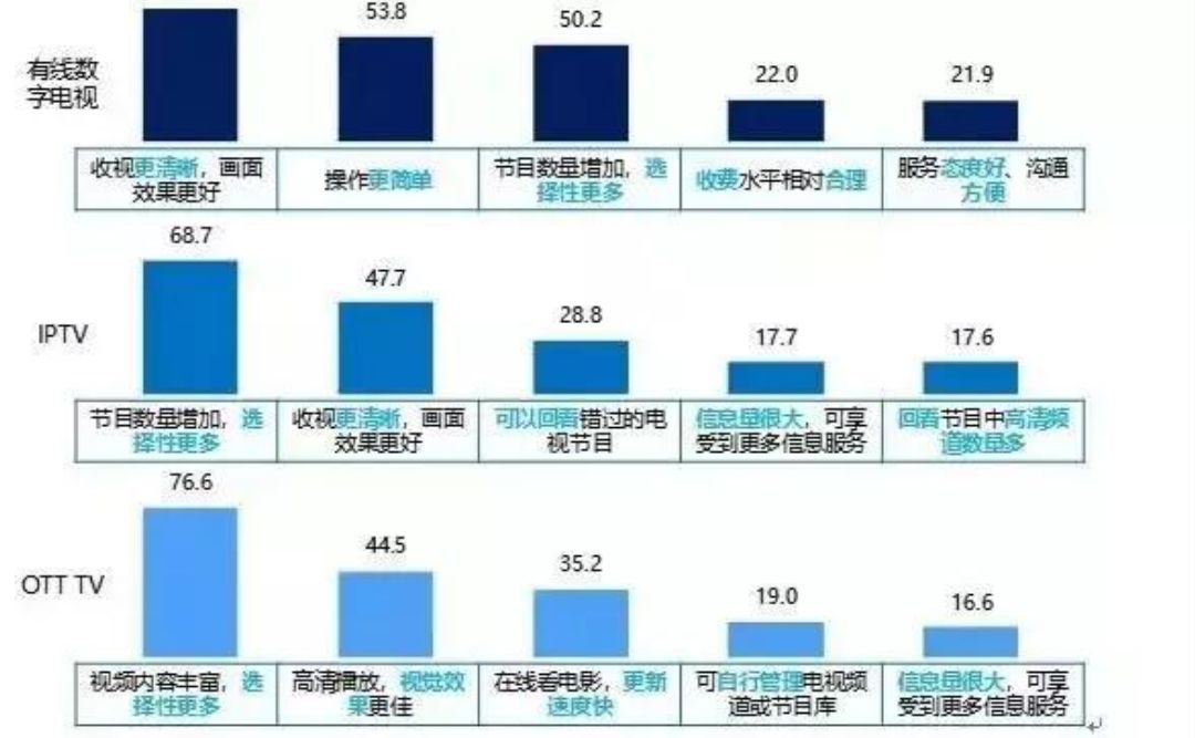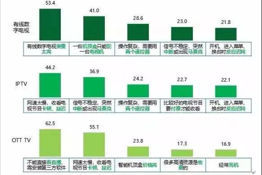從用戶的不滿意程度上看到,網(wǎng)絡(luò)電視速度慢卡頓排在第一位。這也間接印證了有線電視網(wǎng)絡(luò)的優(yōu)勢。(以上調(diào)查來自美蘭德)