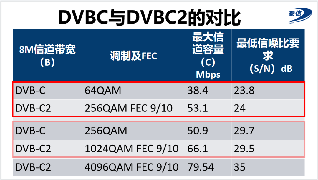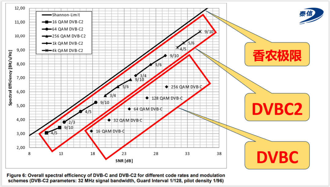 DVBC2通過采用更高階的調制和更先進的編碼技術,將單載波升級為正交多載波,與DVBC相比,信道容量更靠近香農極限。