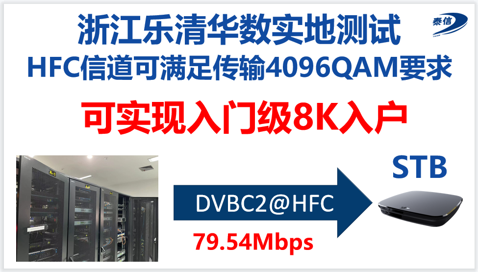 2019年,泰信在華數樂清分公司,實地做了HFC大網DVBC2 4096QAM FEC9/10的測試,8M信道碼流達到了79.54Mbps,表現穩定可靠。