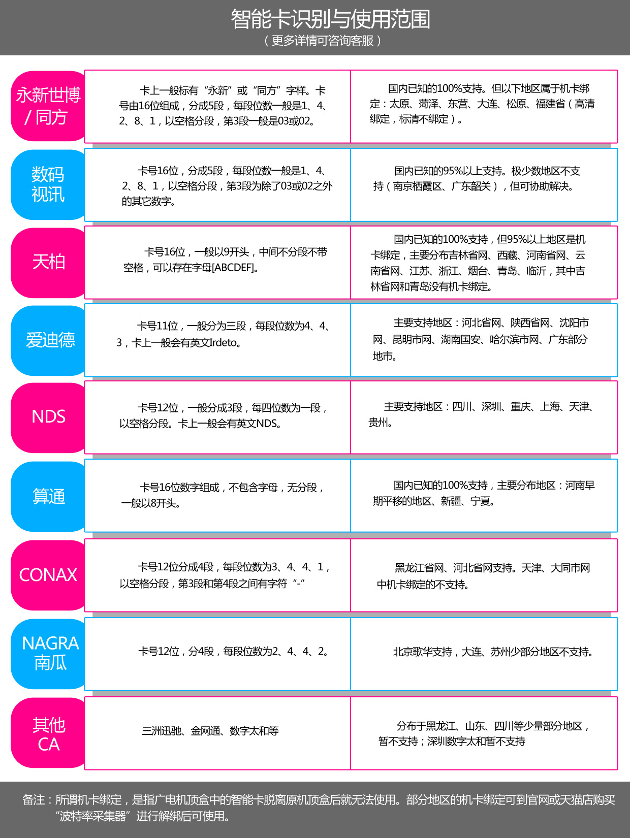 一種方法是從廣電盒子的菜單-系統(tǒng)信息、CA信息或智能卡信息中查看是否有類似“機(jī)頂盒已配對(duì)”或者“配對(duì)成功”的提示信息;另一種方法是把自己的智能卡插入其它采用相同智能卡的廣電盒子,若節(jié)目不能觀看并提示“機(jī)卡不對(duì)應(yīng)”等字樣,則表明該卡是機(jī)卡綁定。