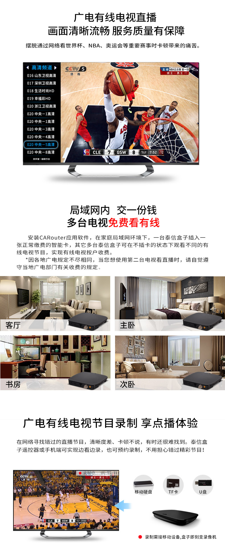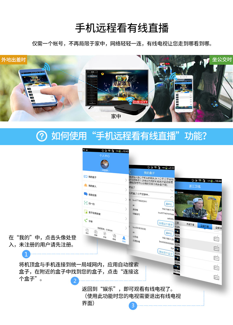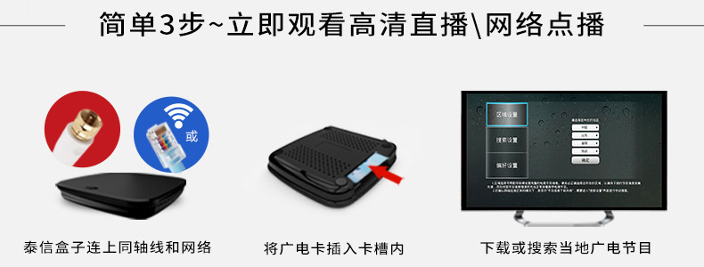 每臺(tái)泰信盒子連接廣電有線信號(hào),并連接到家中的寬帶網(wǎng),將一張正常繳費(fèi)的廣電智能卡插入其中一臺(tái)泰信盒子,其它的泰信盒子無(wú)需插卡就可以收看有線電視節(jié)目,且可獨(dú)立換臺(tái),相互不受影響。