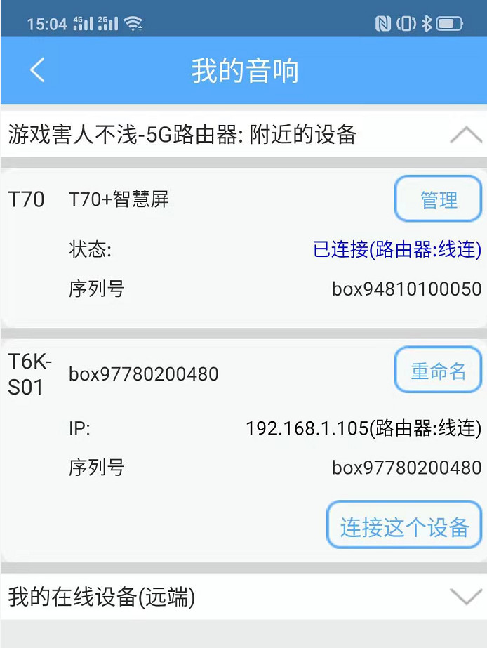 T70和手機連接相同的路由器,手機打開泰信智能家居APK,在”我的\我的設備”中,連接T70(我已將T70名稱改為“T70+智慧屏”)。