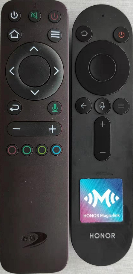 T70的遙控器和智慧屏遙控器差不多大。T70遙控器也是一個學習型紅外線遙控器,整個外殼是深紫紅色半透明,用于透射紅外線,可見其成本是很高的。T70遙控器白色的電源開關鍵用于遙控電視機電源,紅色的用于T70電源遙控,還有4個多功能顏色鍵。藍色的是藍牙/電視切換鍵,按一下進入藍牙音箱,再按一下進入電視模式。 智慧屏的藍牙遙控器延續了互聯網電視簡潔的風格。兩種藍牙語音識別率都比較高,操控比較順暢。