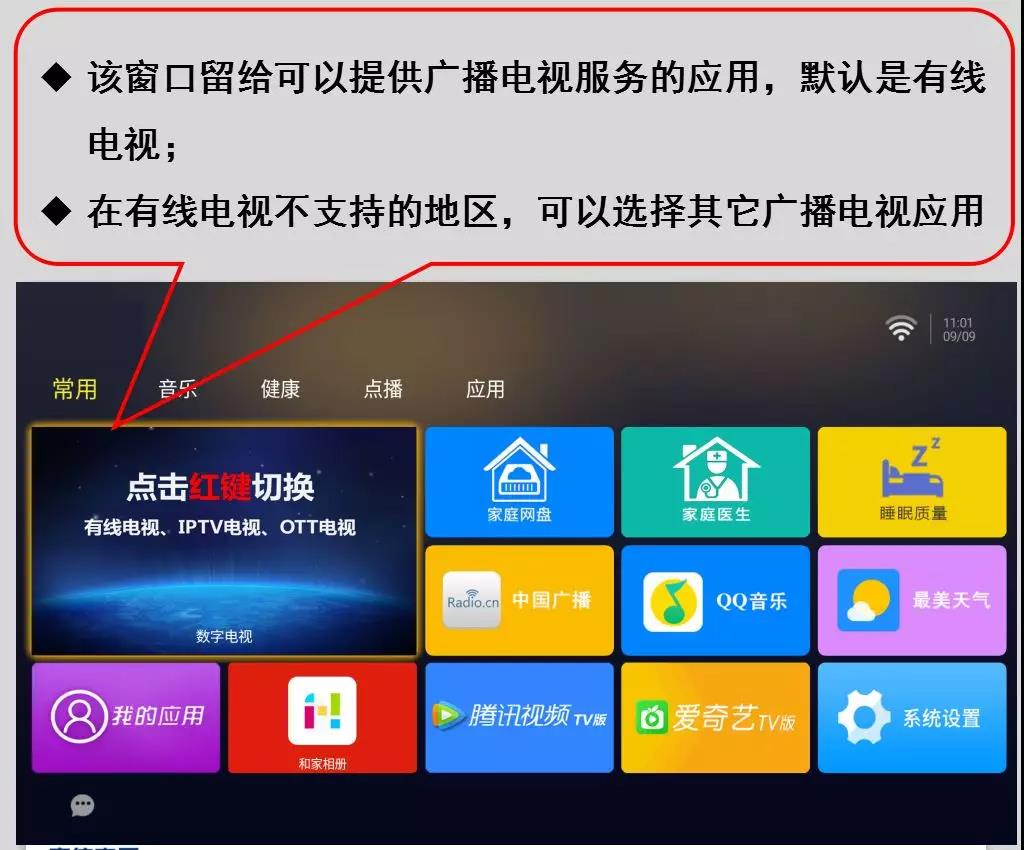 雖然T70在硬件上支持有線電視,也在出廠前作為默認,但一些地方的有線電視業務仍然只捆綁自己的機頂盒。這時,T70給了用戶更多的選項:將焦點移到直播電視窗口,點擊遙控器上的紅色按鍵,切換廣播電視服務提供商,將選擇權還給用戶。