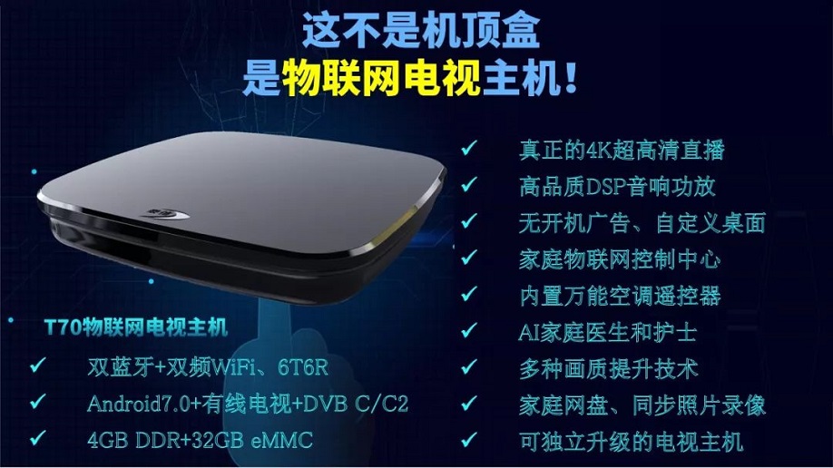 泰信率先推出了物聯網電視主機T70。隨后華為推出了針對增量電視升級的智慧屏: