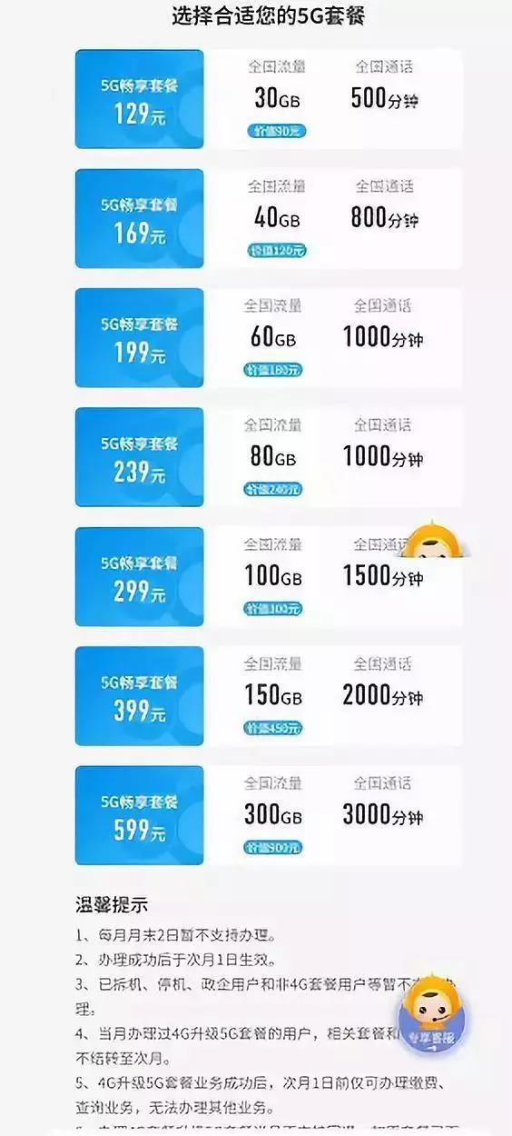 11月1日,三大電信運營商的5G套餐出爐,價格出奇一致,電信聯通套餐價格一樣: